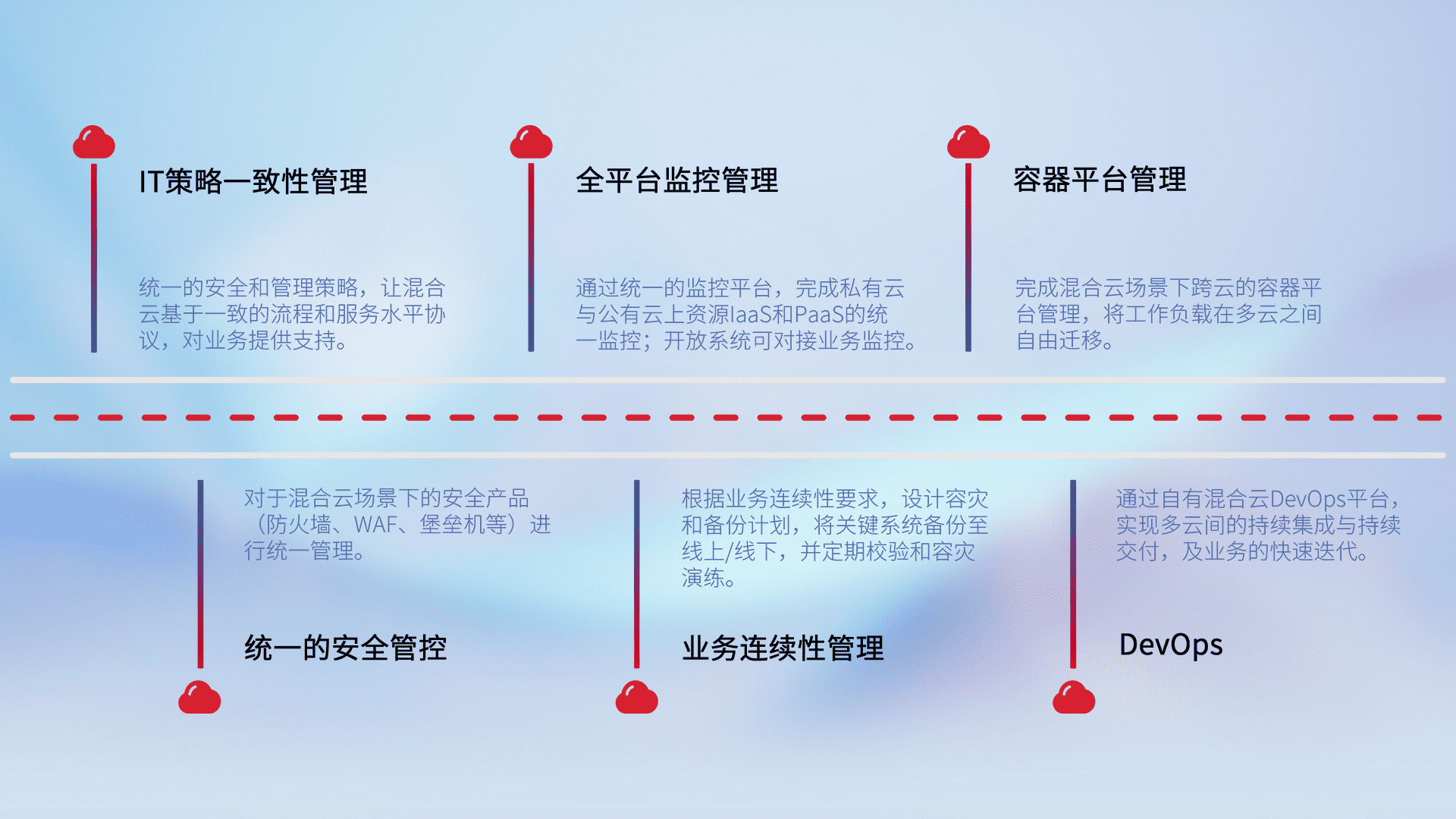 通过多云纳管,,,,以统一的资源数据模型把客户的云资源进行抽象和封装,,,,进而实现对多云资源的统一操作,,,保障云资源管理的可靠性、、、、稳定性与可用性。。量身定制化运维内容,,,,配置、、、开发运维、、、、补丁管理、、、备份、、、、监控、、、认证和访问管理、、、审计和日常巡检等,,,保障在用云过程中的可靠度,,稳定度以及高可用率。。