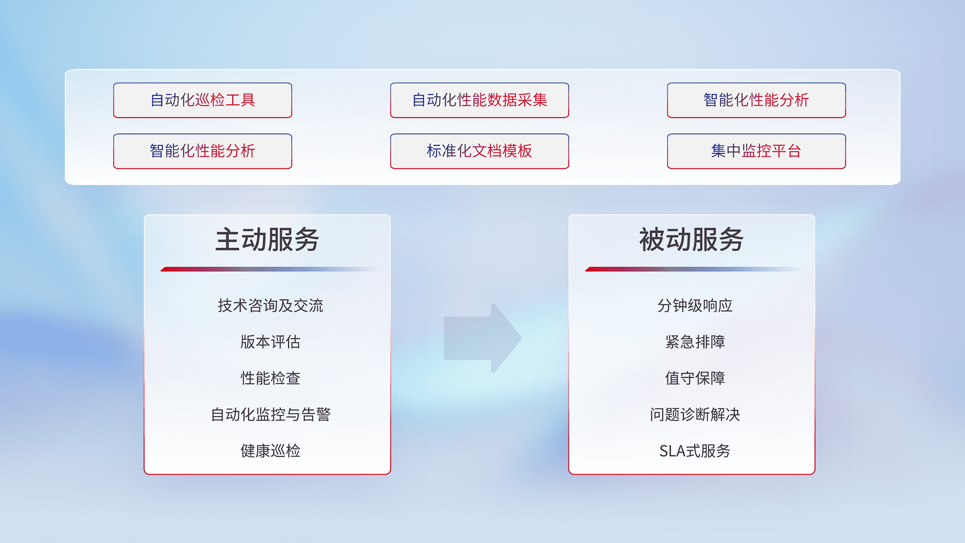 智能化工具和标准化文档,,,保障服务质量,,提供主动服务(包含技术咨询、、版本评估、、、性能检查、、自动化监控与告警、、健康巡检)和被动服务包含(分钟级响应、、紧急排障、、值守保障、、、、问题诊断解决、、、SLA服务)。。